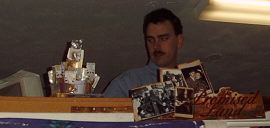 In the meantime, a carless entry has joined the game. Everybody watches nervously as he strolls up to the front door and gazes at the chairs there. He walks back behind my chair and stands there. I get out and ask him if he would like to sit in the truck. He says "Maybe in a while." He's got a hooded winter coat on but he looks cold. He amuses himself by reading all the promo material in the window. He has that long, tangled hair that Eddie Vedder used to favor. Here he comes...